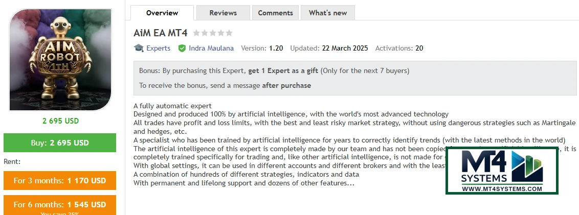 AiM EA MT4 is a next-generation automated Forex trading system designed for MetaTrader 4, leveraging AI-powered algorithms to execute high-probability trades. Built for both novice and expert traders, this Expert Advisor (EA) ensures consistent profitability with minimal manual intervention.