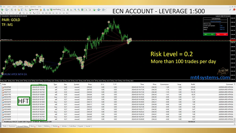 The Aurum Apex MT4 EA is a powerful high-frequency trading (HFT) Expert Advisor built specifically for Gold (XAUUSD). Designed to run on the M1 timeframe, it takes advantage of micro price movements to capture consistent profits. When used on an ECN account with 1:500 leverage, the EA can execute 100+ trades per day while maintaining a safe risk level of 0.2, making it one of the most reliable and efficient gold scalping systems available.