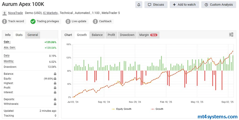 Extensively tested on historical and live market data, Aurum Apex MT4 shows consistent monthly gains with controlled drawdowns, making it reliable for long-term growth and prop firm challenges.