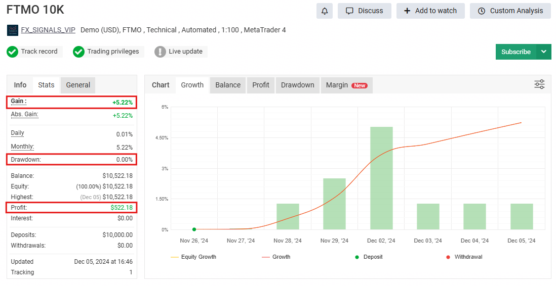 The performance of Finvesting EA MT4 (FTMO 10K EA) is monitored through Myfxbook, a trusted third-party Forex account verification platform.