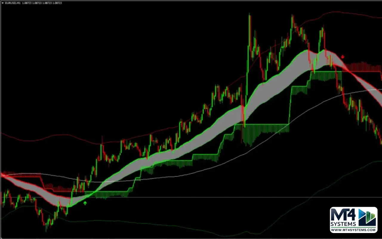 The JackPot Strategy Elite MT4 Indicator V4.4 is built around the concept of Bollinger Bands, displaying dynamic lines on the chart in green and red to represent potential price action zones. Additionally, it highlights key zones with distinct colors—red, white, and green—to help traders identify optimal entry and exit points.