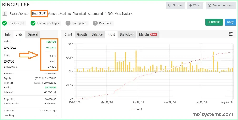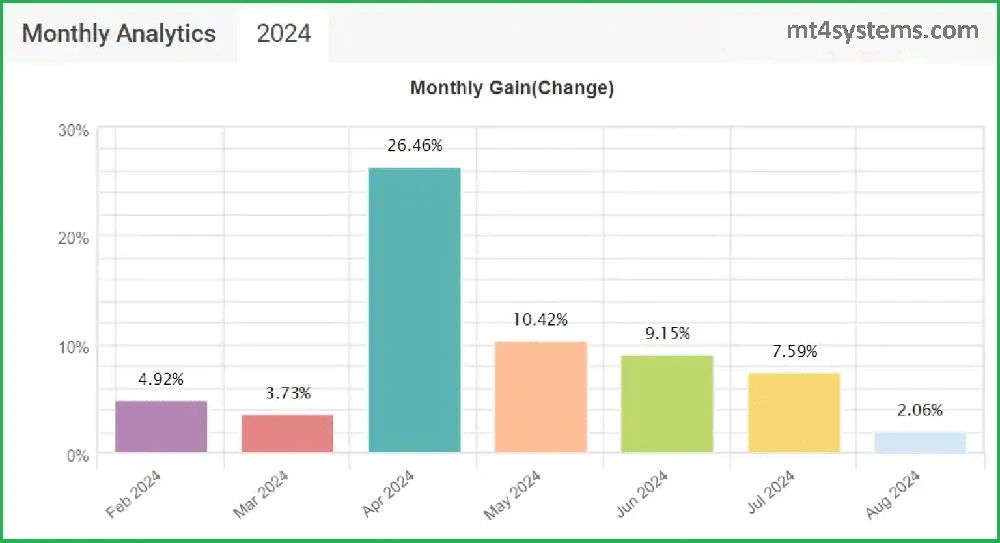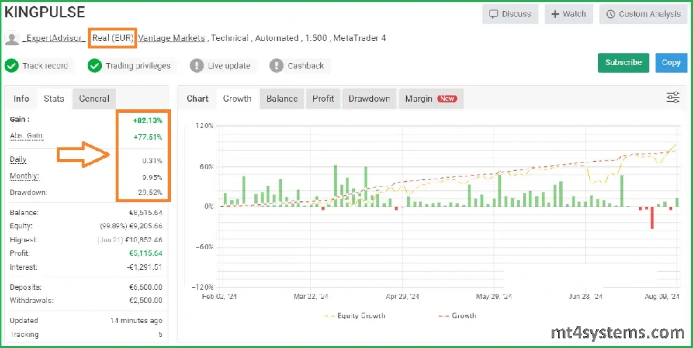 KingPulse FX EA has demonstrated consistent profitability and stable performance in live trading conditions. Verified by MyFxBook, the EA showcases an impressive 82% overall profit performance with an average monthly return of 10%, reflecting its strong potential for long-term, sustainable gains.