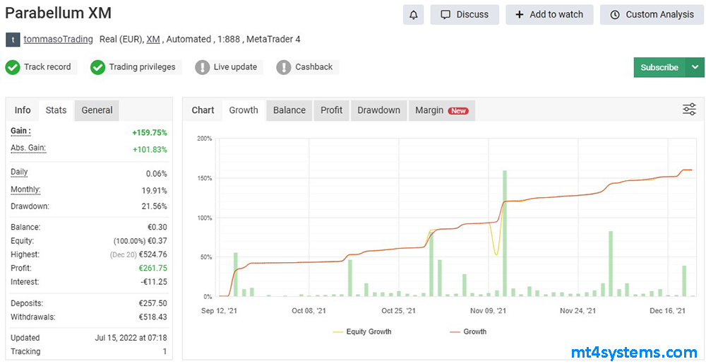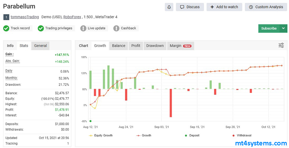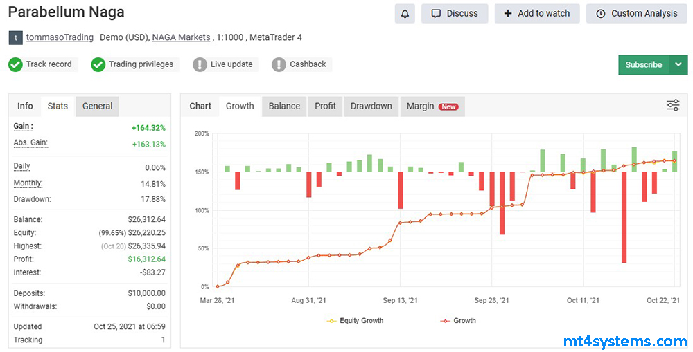 The Parabellum EA MT4 stands out for its consistent growth and controlled drawdown performance. Traders choose it over many other Expert Advisors because it prioritizes smart risk management while still achieving reliable and profitable results. Take a look at the following image.
