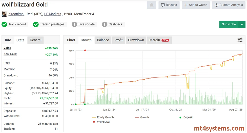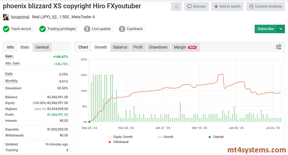 The Phoenix Blizzard GOLD EA has proven its profitability through verified MyFxBook results. Running on a live JPY-denominated account with XS Broker and 1:500 leverage, this expert advisor achieved an outstanding +483.57% total gain over an extended trading period. Even with such strong growth, it maintained a controlled maximum drawdown of just 16.77%, highlighting its balance between performance and risk management.