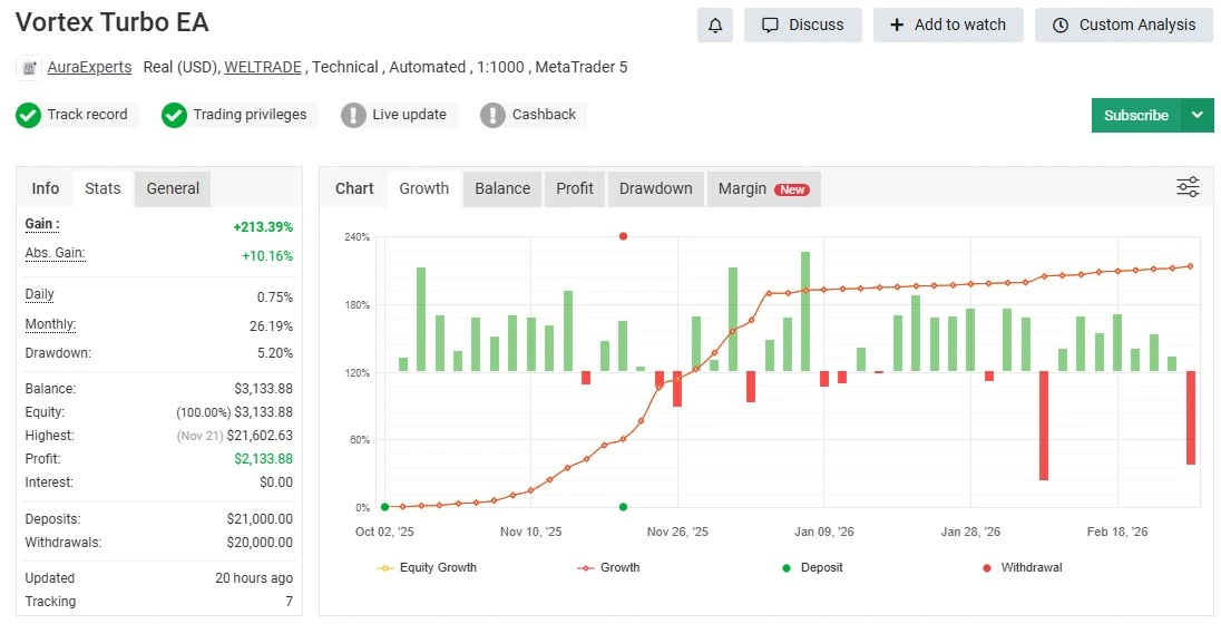 The Myfxbook account provides clear insight into how Vortex Turbo EA MT4 performs under real market conditions — not just backtest simulations.