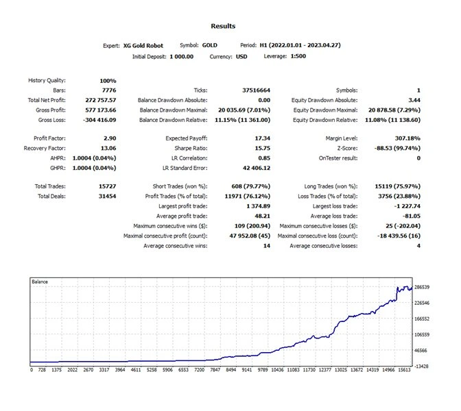 The backtest results below demonstrate how XG Gol Robot MT5 performed over historical market data using high-quality modeling.